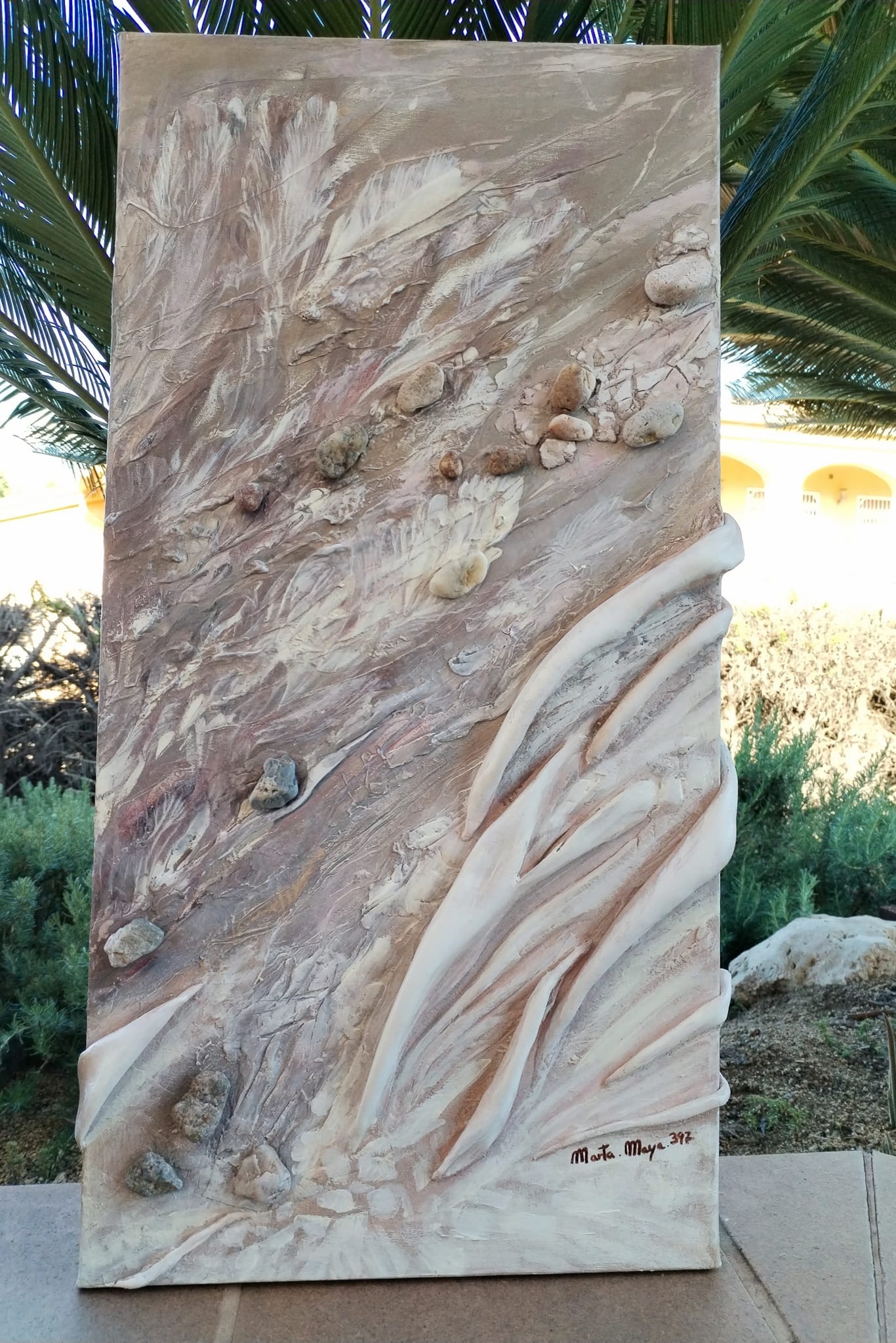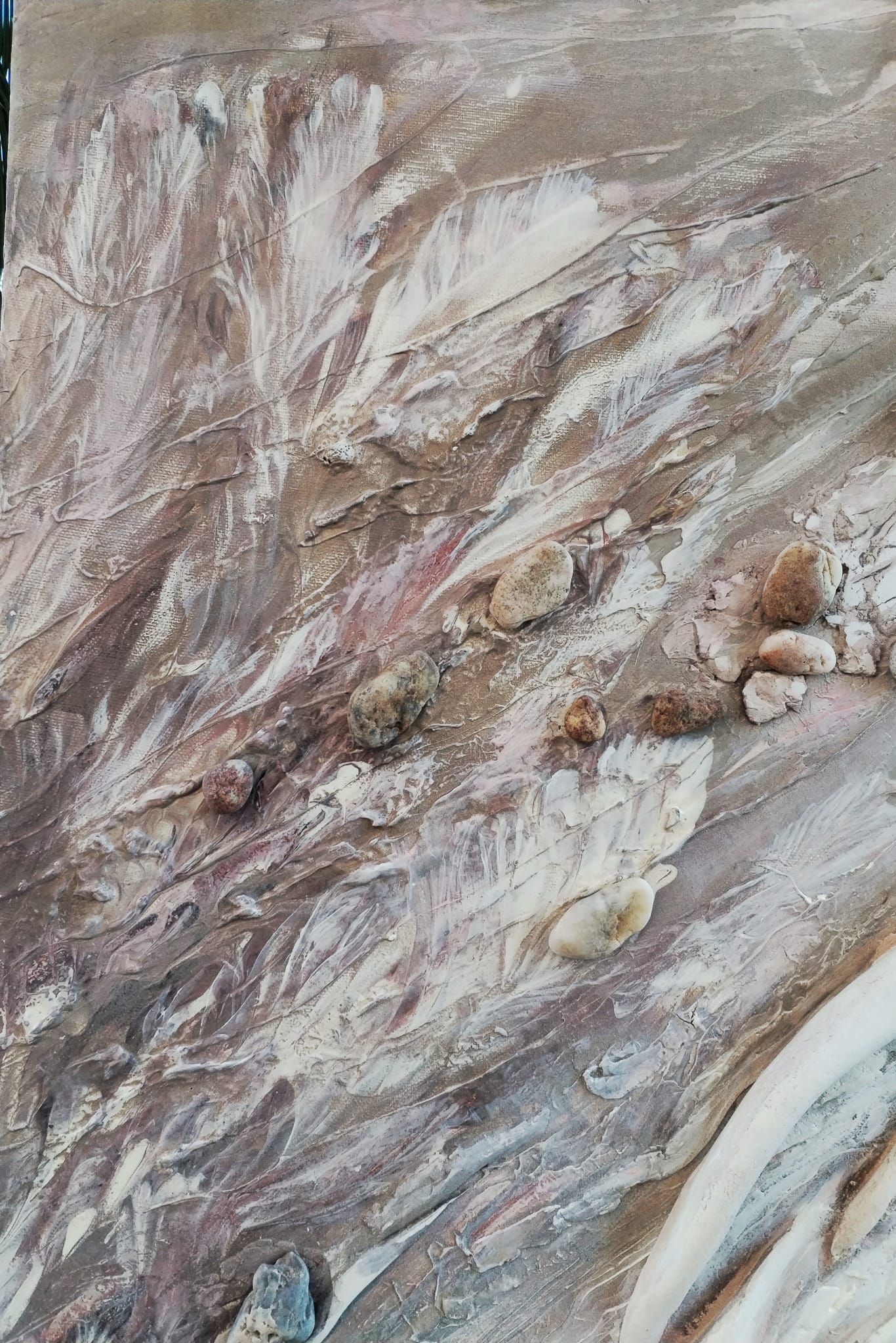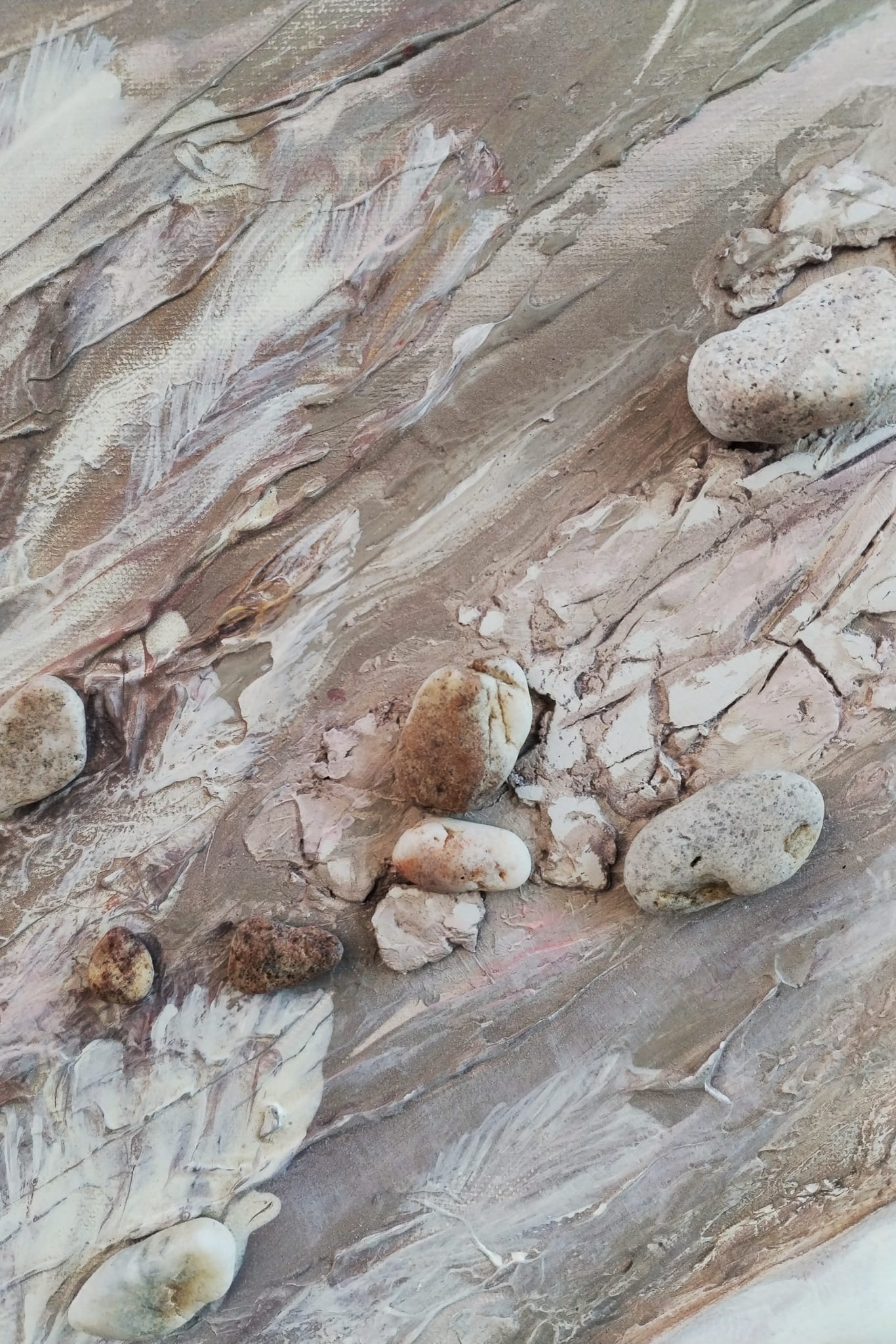 Pouring con acrílico, texturas en relieve e incorporación de elementos naturales como piedras, que aportan fuerza y autenticidad a la obra.