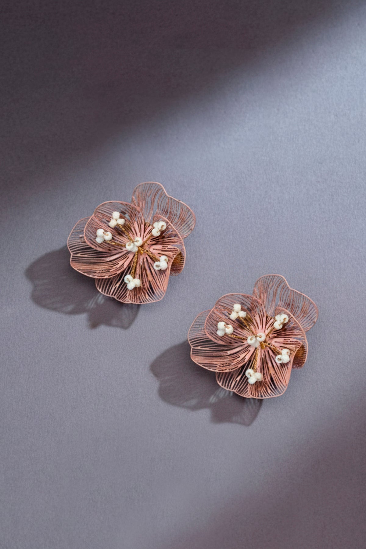 Base de los pendientes de acero inoxidable, ramilletes de cuentas en blanco y flor de latón bañada en color rosa vintage.