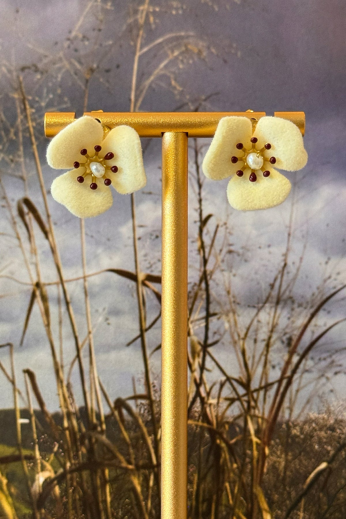 Los pendientes Everest capturan la belleza de una flor que resiste en las alturas, delicada y luminosa. Su textura aterciopelada en color crudo aporta una suavidad táctil y visual, mientras los detalles en dorado y granate crean un contraste cálido y muy sofisticado.